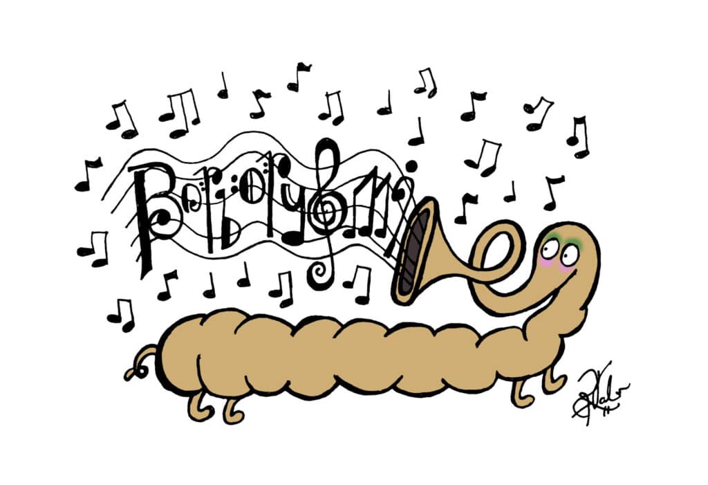 Borborygmi er en arkaisk, klinisk betegnelse for besværlige, buldrende buklyder: rumling (1; fig. 1). Fenomenet har vært kjent av leger fra arilds tid, men tanken om at abdominal auskultasjon kan gi innsikt i magetarmkanalens mekanikk, er relativt ny. Robert Hooke (1635–1703) skrev følgende – mer enn 100 år før stetoskopet ble oppfunnet av René Laënnec (1781–1826): «[…] it may be possible to discover the Motions of the Internal Parts of Bodies […] by the sound they make, that one may discover the works performed in the several Offices and Shops of a Man’s Body, and thereby discover what Instrument or Engine is out of order, what Works are going on at several Times and lie still at others» (sitert i 2). Som forskningsverktøy har fonoenterografien (3) ikke fått noe stort gjennomslag, men i klinikken er stetoskopi av buken fortsatt en viktig undersøkelse, spesielt ved akutt abdomen. Lyder fra magetarmkanalen, inkludert vibrasjoner fremkalt av gasspassasje gjennom åpningene (ructus og flatus), kan dessuten – som all akustikk – inkorporeres i og inspirere til musikk.