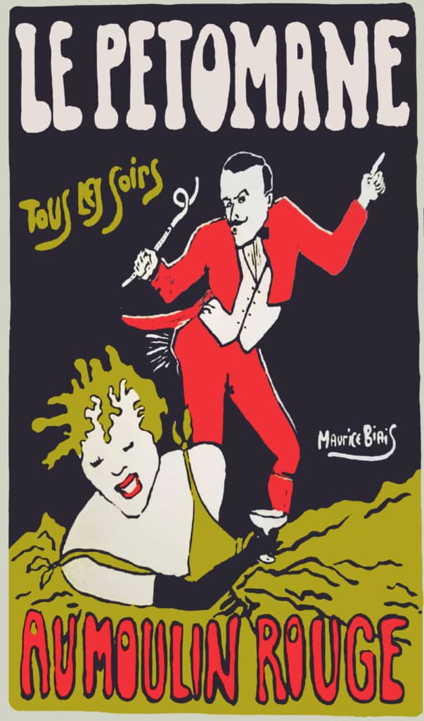 Figur 2. Flatufonisten Joseph Pujol (1857–1945), med kunstnernavnet Le Pétomane, hadde et uvanlig talent – beskrevet slik av ham selv: «[…] mon anus est d’une telle élasticité que je l’ouvre et le ferme à volonté […]» (sitert i 4). Pujol var ansatt ved Moulin Rouge, hvor han underholdt publikum med å fremføre musikk ved vekselvis inhalasjon og ekshalasjon av luft gjennom endetarmsåpningen. Det har vært mange flatufonister både før og etter Le Pétomane, men ingen har hatt like brakende suksess. Faksimile av plakat fra Molin Rouge.