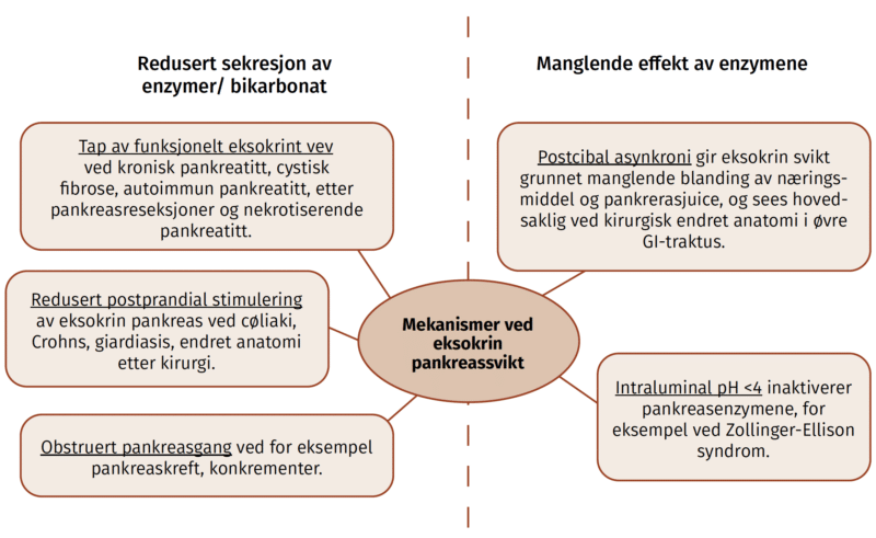 Intakt eksokrin pankreasfunksjon er en viktig del av fordøyelsen og bidrar til å sikre normal ernæringsstatus. Ved eksokrin pankreassvikt kan pasientene ha symptomer som oppblåsthet, diaré, steatore, magesmerter og flatulens. Eksokrine svikt kan også føre til malabsorbsjon av protein, fettløselige vitaminer, mikronutrienter med påfølgende vekttap, osteoporose og sarkopeni (2-4). Ettersom det er stor variasjon i symptombyrde og grad av ernæringssvikt, er det også store ulikheter i hvordan eksokrin svikt påvirker livskvaliteten og langtidskomplikasjoner.