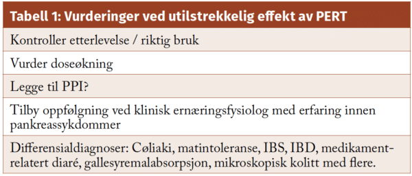 De siste årene har det vært økt fokus på den betydelige forekomsten og konsekvensene av eksokrin pankreassvikt hos pasienter med pankreaskreft. Ettersom patogenesen særlig er relatert til tumorobstruksjon av pankreas hovedgangen, er forekomsten særlig høy ved tumor lokalisert i caput pankreas og ved avansert sykdom (prevalenser mellom 66% og 80%) (11-13). Alle pasienter med pankreaskreft bør testes, og behandling med PERT er anbefalt ved påvist svikt. Det er åpning for å starte tidlig med PERT og ernæringstiltak så snart cancerdiagnose er satt, uten å vente til svar på eksokrin testing foreligger. Nasjonale faglige retningslinjer for pankreaskreft anbefaler i tillegg rutinemessig postoperativ substitusjon med PERT etter pankreatoduodenektomi og total pankreatektomi uavhengig av testing (14). Ubehandlet eksokrin svikt gir dårligere prognose og redusert livskvalitet hos disse pasientene.
