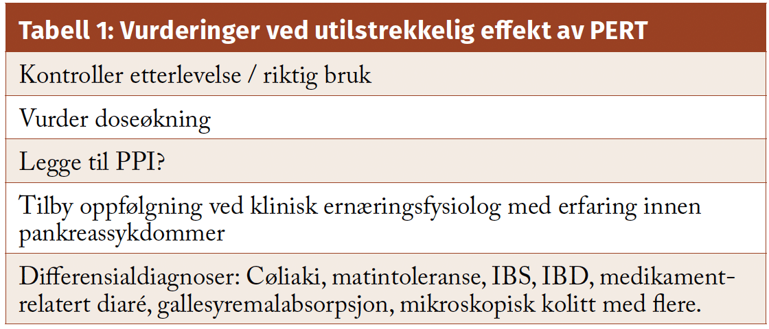 Gjennom de nye europeiske retningslinjene presenteres en mer klinisk relevant definisjon for eksokrin pankreassvikt. Tilstanden defineres ikke lenger ut fra redusert pankreassekresjon alene, men legger vekt på funksjonssvikt alvorlig nok til å kunne gi symptomer og/eller påvirket ernæringsstatus. Behandlingen som består av PERT kombinert med gode kliniske ernæringsråd, er viktig for å oppnå behandlingsmålene i form av normalt kosthold, bedret ernæringsstatus og reduserte symptomer, og for å hindre komplikasjoner som osteoporose og sarkopeni.