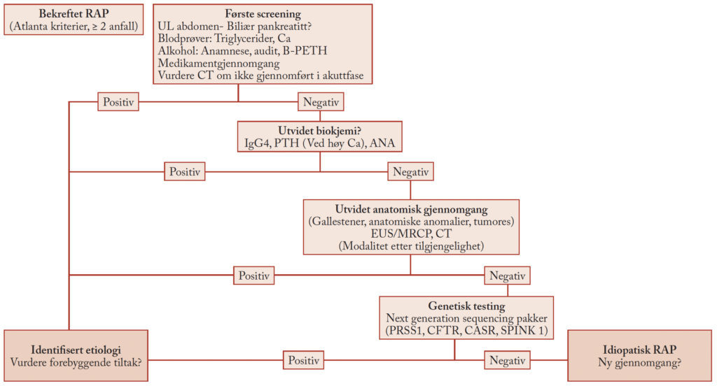 Etiologisk gjennomgang med støtte i Tigar-O klassifikasjonen er nødvendig og nyttig for å identifisere forebyggende tiltak. Forekomst av etiologiske faktorer endrer seg gjennom forløpet fra første AP og frem mot etablert kronisk pankreatitt. Dette bør avspeiles i rekkefølge av utredningen. I tabellen nedenfor presenteres hvilke faktorer som bør gis fokus og hvilke tiltak mot de enkelte faktorer som kan gi effekt. Vi presenterer også et forslag til flowchart for utredning av RAP (figur 1).